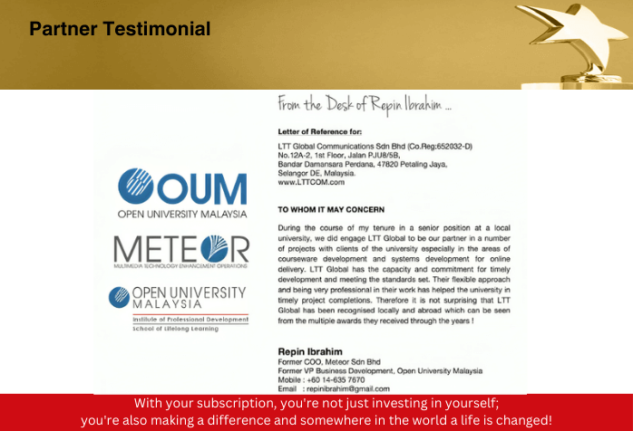 "During my time in a senior role at a local university, we partnered with LTT Global on various projects, particularly in courseware and systems development for online delivery. LTT Global demonstrated the capacity and commitment to meet deadlines and standards. Their professionalism and flexibility contributed to our successful project completions. It’s no surprise that LTT Global has received multiple awards and recognition both locally and internationally."